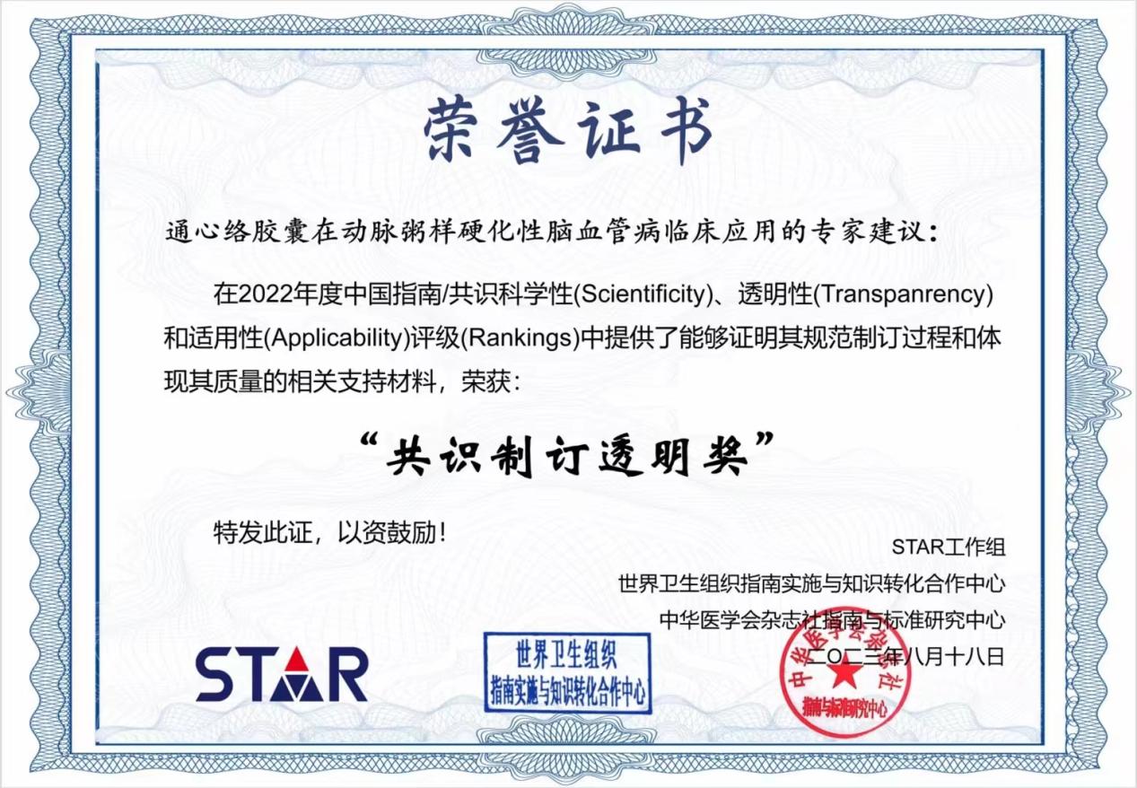 由国家神经疾病医学中心(华山)副主任、复旦大学附属华山医院董强教授和中华医学会神经病学分会脑血管病学组副组长、首都医科大学附属北京天坛医院赵性泉教授牵头,上海卒中学会、北京脑血管病防治协会共同组织相关学科众多专家编写的《通心络胶囊在动脉粥样硬化性脑血管病临床应用的专家建议》在本次评级中获评年度“共识制订透明奖”。