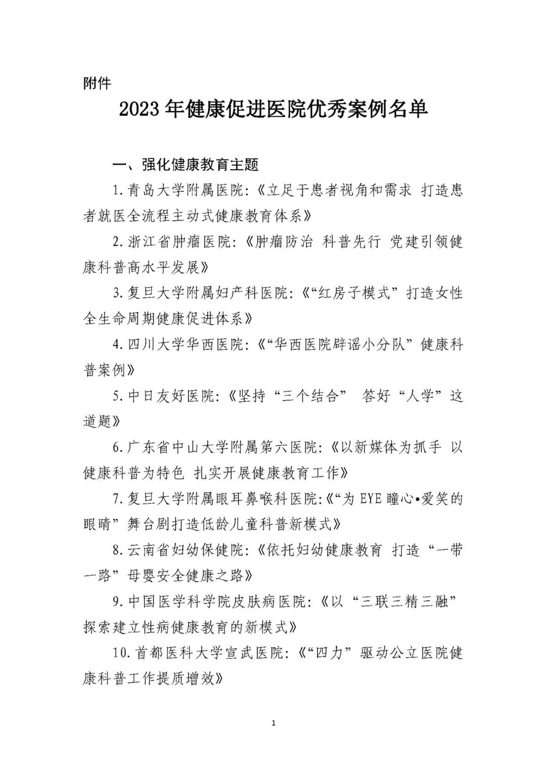 关于通报2023年健康促进医院优秀案例征集结果的函
