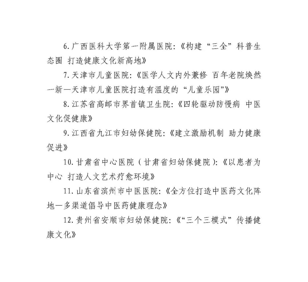 为更好维护患者、医务人员和公众健康,推动医院从“以治病为中心”向“以人民健康为中心”转变,2023年国家卫生健康委、国家中医药局联合开展了健康促进医院优秀案例征集活动,现将征集活动情况通报如下: