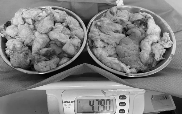 经过充分的前期检查和术前准备,刘芳主任团队为其进行了单孔腹腔镜下全子宫切除术+双侧输卵管切除术,术中可以看见子宫肌瘤从盆腔延续达肝下缘,其中一个巨大阔韧带肌瘤,血供丰富,压迫输尿管。凭借精湛的手术技巧,刘芳主任成功实施手术摘除了巨大子宫肌瘤,术后称重达4.79kg。