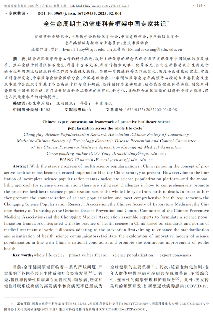 2025年1月,全国首部《全生命周期主动健康科普框架中国专家共识》(以下简称《共识》)于中国科技核心期刊《检验医学与临床》杂志正式发布。