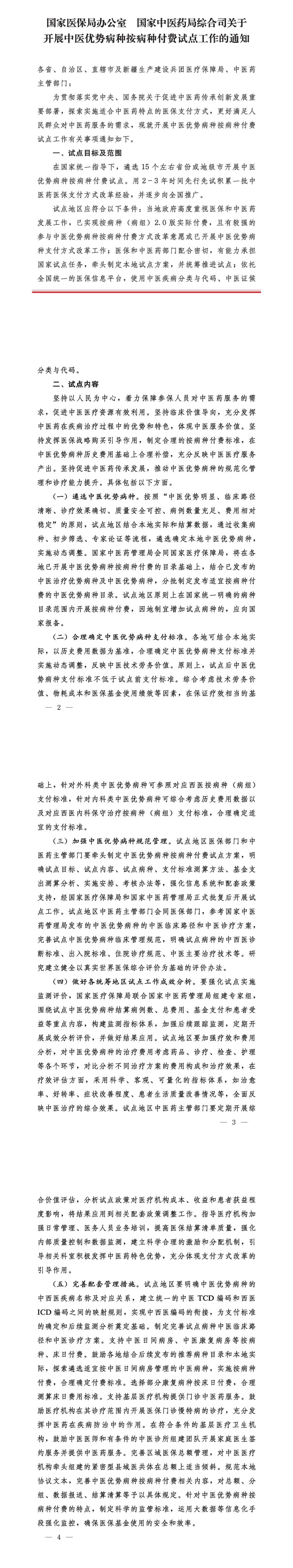 通知确定了试点目标及范围。在国家统一指导下,遴选15个左右省份或地级市开展中医优势病种按病种付费试点。用2~3年时间先行先试积累一批中医药医保支付方式改革经验,并逐步向全国推广。