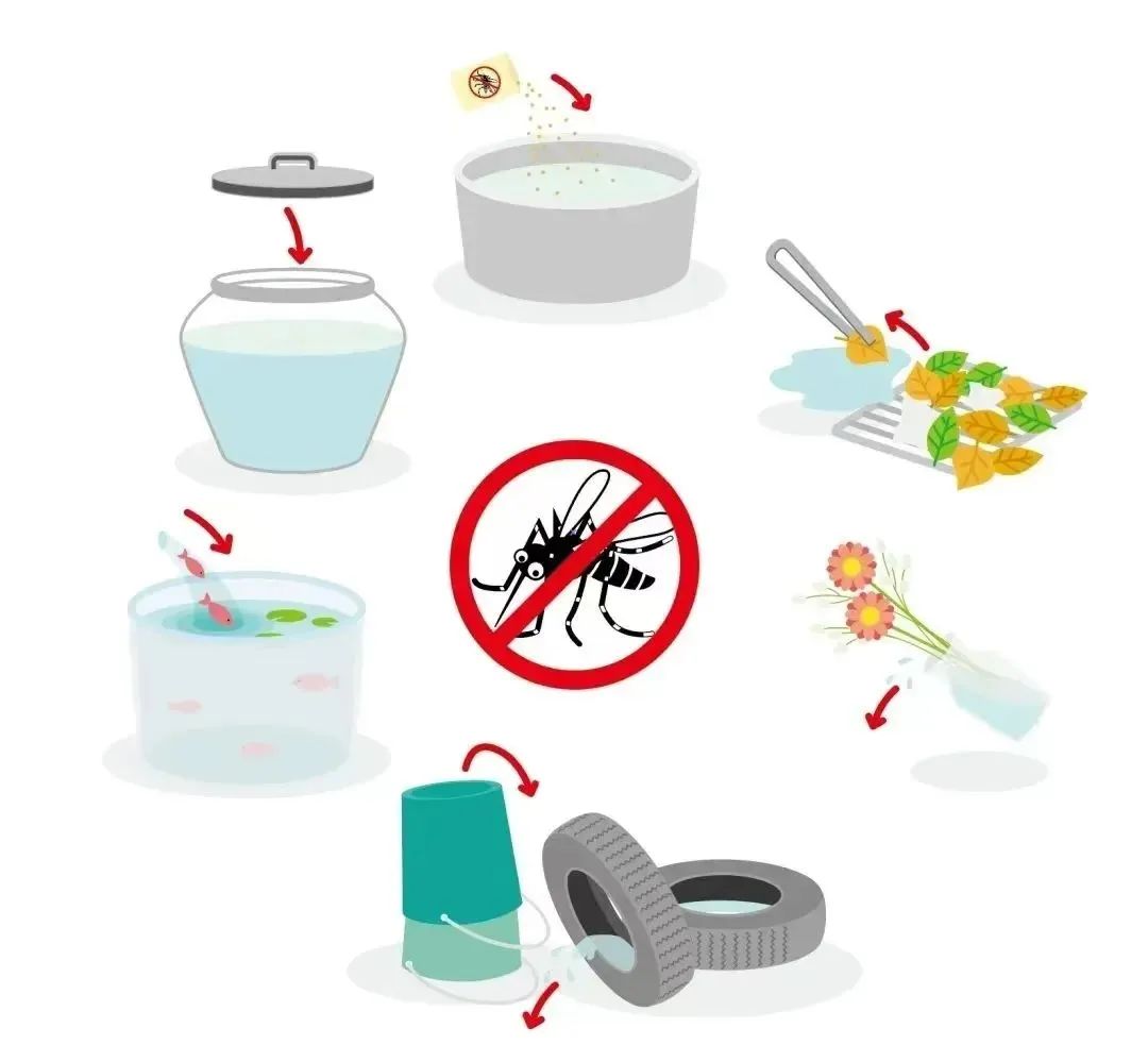 清除各种积水和积水容器,水培植物每隔七天换水洗瓶,控制蚊虫孳生,房间适时安装纱门纱窗。