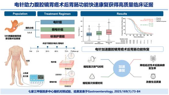 术后肠麻痹是胃癌术后常见的并发症之一,也是影响患者康复的重要因素。电针在调节胃肠功能方面具有疗效优势,既往研究多聚焦开放手术或结直肠癌,缺乏针对腹腔镜胃癌切除术的高质量证据。南京中医药大学附属医院孙建华、郭静团队通过585名接受腹腔镜胃癌胃切除术患者的多中心随机对照试验,验证了电针可显著缩短首次排气时间和首次排便时间,并降低延迟性术后肠麻痹的发生率,改善术后活动功能和生活质量,研究成果2025年发表在Gastroenterology。该进展为胃癌加速外科康复中西医结合方案提供循证医学证据。