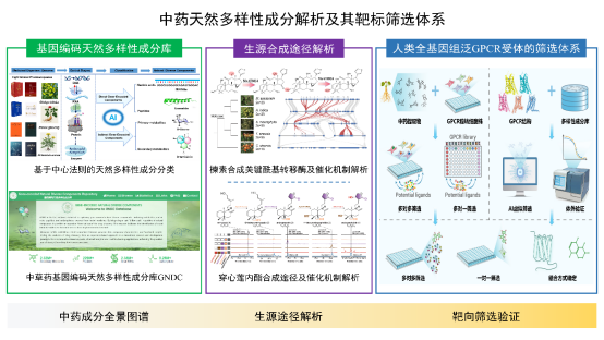 天然多样性成分是中药发挥疗效的物质基础,解析其生源合成途径,筛选其作用靶标,对推动中医药现代化具有重要意义。成都中医药大学陈士林、丛朝彤团队与中国中医科学院中药研究所孙伟团队通过自主开发的基因组遍历算法,结合转录组、小RNA测序等技术实现了对1037个药用物种的天然多样性成分挖掘与验证,建成了亿量级中草药基因编码天然多样性成分库GNDC。利用多组学方法,阐明了穿心莲内酯的四步氧化修饰路径,鉴定出ApCYP71D587等四个关键P450酶;通过印楝与苦楝比较基因组学分析,识别出了柠檬苦素生物合成关键区域,阐明了其酶功能演化机制及种间合成差异。建立了人类全基因组泛受体药物发现平台,实现了从“多对多”到“一对一”的药靶筛选模式。研究成果2025年发表在The Innovation、Angewandte Chemie、Nature Communications等。该进展为中药创新药物研发提供了从数据基础、生源合成途径到靶标筛选的技术支撑。