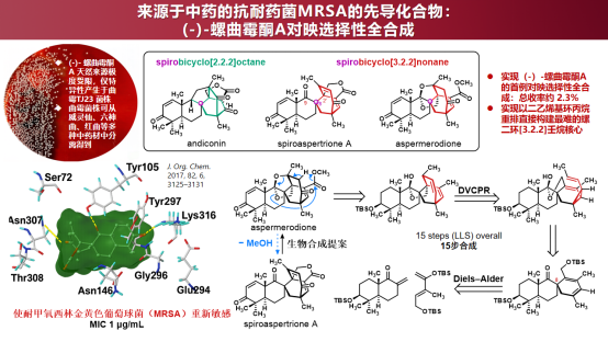 多重耐药病原体构成全球健康的重大威胁,其中耐甲氧西林金黄色葡萄球菌(MRSA)被WHO列为“高优先级耐药病原体”。上海中医药大学Fabian Schneider、黄文伯团队和德国康斯坦茨大学Tanja Gaich团队,首次合成了从曲霉菌株中分离得到的、具有强效抗耐甲氧西林金黄色葡萄球菌(MRSA)活性的高活性成分(-)-螺曲霉酮A。曲霉菌株常与红曲等中药伴生,然而(-)-螺曲霉酮A具有高度功能化的多环骨架结构,天然来源有限且合成难度大。项目团队首次实现其对映选择性全合成,为解析其对MRSA等耐药菌的抗生素增敏/协同机制提供关键物质基础。研究成果2025年发表在Science。该进展成功构建了该分子中极具挑战性的螺环核心骨架,并为理解该类天然产物的生物合成途径提供了化学依据。