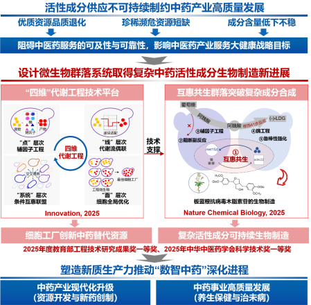 微生物难以模拟植物多组织细胞时空代谢协作,中药复杂成分的生物制造常难以实现。海军军医大学张磊团队、上海中医药大学陈万生团队和中科院大连化学物理研究所周雍进团队,提出“四维”代谢工程,设计酵母多细胞互惠群落模仿植物时空代谢分工。以阿魏酸为代谢节点,将41步合成途径拆解,完成板蓝根抗病毒成分落叶松脂素双糖苷的异源合成。研究成果2025年发表在Nature Chemical Biology、Innovation等,获2025年度教育部工程技术研究成果一等奖和中华中医药学会科学技术一等奖。该进展在国际上实现了复杂落叶松脂素双糖苷的微生物从头合成,证明了利用微生物群落突破合成瓶颈的可行性。