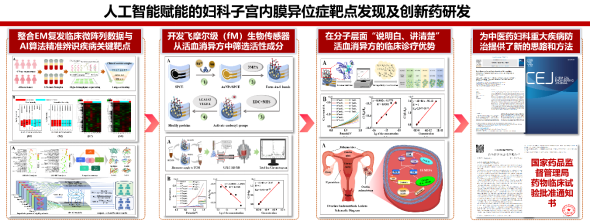 子宫内膜异位症手术占妇科手术的四分之一,术后五年复发率高达50%,是临床亟待攻克的妇科难题。中国中医科学院广安门医院赵瑞华、张永嘉团队和北京中医药大学吴志生团队构建了信息技术与生物技术闭环驱动的靶点识别与成分辨识体系,采用AI算法和生物传感技术精准识别出子宫内膜异位症复发关键靶点VEGFA与LGALS3,定位香叶醇与丹酚酸B的靶向调控作用,实现临床验方功效成分的定向识别。研究成果2025年发表在Chemical Engineering Journal。该进展成功转化中药创新药“活血消异颗粒”,并开展Ⅱ期临床试验。