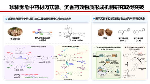 大量珍稀濒危中药材药效成分的生物合成机制尚不明晰,严重制约了珍稀濒危中药材及其药效成分的规模化生产和产业化发展。北京大学和北京中医药大学中药现代研究中心屠鹏飞团队完整解析了濒危中药肉苁蓉核心药效物质苯乙醇苷(如松果菊苷)的生物合成全途径,并实现系列苯乙醇苷类成分在本氏烟中的从头合成;屠鹏飞团队还揭示了名贵中药沉香药效物质苯乙基色酮生物合成及调控机制。研究成果2025年发表在Nature Communications、Plant Journal、Plant Biotechnology Journal等。该进展为从分子层面解读中药药效物质的形成机制及其异源合成设立了新范式。