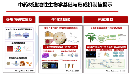 道地药材优良品质的生物学基础、形成与调控机制是中药道地性研究亟需回答的核心科学问题。中国中医科学院郭兰萍、黄璐琦团队创新开发了基于柔性基底的双离子模式与印迹技术结合的植物代谢物高分辨成像平台;揭示了调控基因在人参不同细胞类型中呈现差异化表达,发现PgTCP-PgEPF通过互作网络调控表皮发育影响人参皂苷生物合成;系统证实了苍术素等多炔是苍术“朱砂点”红色特征的物质基础,阐明其与道地苍术特有化学型及核心药效协同的内在机制。研究成果2025年发表在Plant Biotechnology Journal、Molecular Horticulture、Journal of Integrative Plant Biology等。该进展为中药道地性成因解析与道地药材系统评价奠定了重要基础。