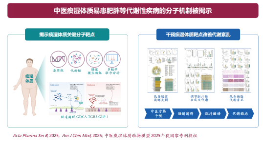 痰湿体质是多种代谢性疾病的“共同土壤”,但痰湿体质“体-病相关”的生物学基础及分子机制尚待阐明。北京中医药大学姚海强、万瑾毅团队揭示痰湿体质呈现特征性的肠道菌群失调,致使关键次级胆汁酸甘氨脱氧胆酸水平显著下降从而抑制TGR5信号通路,进而阻碍棕色脂肪组织产热和回肠GLP-1分泌,最终导致肥胖及代谢紊乱。研究成果2025年发表在Acta Pharmaceutica Sinica B、American Journal of Chinese Medicine等。该进展从胆汁酸代谢角度揭示了痰湿体质易发代谢性疾病的生物学基础,为代谢性疾病的早期筛查及中医药早期防治提供了新策略。