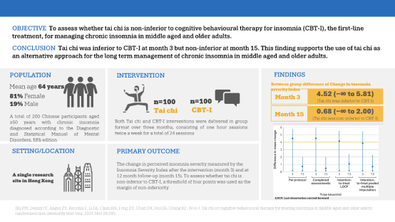 失眠是老年人常见的睡眠障碍,与心血管疾病、精神疾病及认知能力衰退等严重疾病风险息息相关。既往研究虽指出太极拳对睡眠具有正面影响,但是,一直缺乏严谨科学证据将太极拳与标准临床治疗进行比较。香港大学萧明辉团队首次直接比较了太极拳与失眠认知行为疗法对慢性失眠的长期疗效。结果表明,太极拳在改善患者睡眠质量、减轻失眠严重程度方面的长期疗效与失眠认知行为疗效相当。研究成果2025年发表在BMJ。该进展用科学数据成功架起了传统智慧与现代科学之间的桥梁,为全球失眠者提供了更多治疗选择。