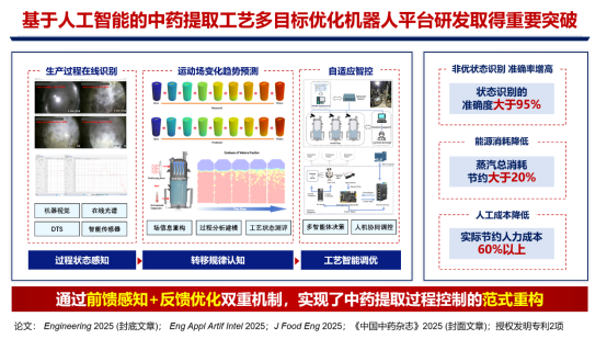中药提取工艺为中药制药过程的核心环节,传统手段无法对生产核心过程进行实时感知。天津中医药大学李正、程翼宇团队研制了基于人工智能(AI)的提取过程多目标优化制药机器人平台。通过隐性经验显性化、黑箱过程透明化、局部决策全局化,将控制思路从单一的“基于温度调控”提升为面向整体运行机制的“基于状态调控”。该平台能够有效分析成分传递规律、监测温度变化并识别沸腾状态,实现状态识别准确率提升,节约蒸汽与人力成本。研究成果2025年发表在Engineering等,授权发明专利2项。该进展将AI前沿技术与中药制药工程学相融合,破解生产规律量化及过程多目标实时测控难题。