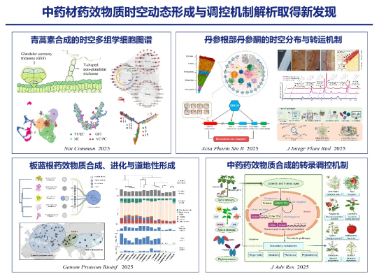 海军军医大学谭何新团队绘制首张青蒿素“细胞工厂”高清图谱,确定青蒿素由黄花蒿腺毛中6个分泌细胞特异性合成;揭示了丹参酮在根部周皮特异性积累与染色质可及性及转录调控动态变化紧密协调,以及ABC转运蛋白介导丹参酮细胞外排的新机制;破译了板蓝根靛蓝的生物合成起源于菘蓝属植物“肟途径”相关酶(CYP79B2、FMO1)的新功能进化以及系统总结转录因子调控中药药效物质合成的作用规律等。研究成果2025年发表在Nature Communications、Acta Pharmaceutica Sinica B等。该进展将道地药材药效物质形成的机制研究精度提升至单细胞与进化尺度。