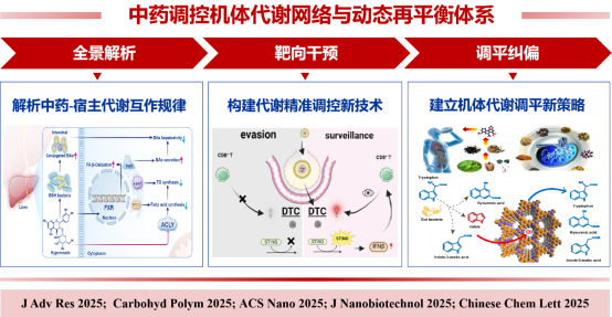 中药多成分、多靶点的复杂科学体系核心内涵在于对机体代谢网络的系统性调控与动态再平衡。天津中医药大学李遇伯团队、澳门大学李绍平团队和山东第一医科大学韩利文团队以代谢网络调控为支点,构建“全景解析-靶向干预-调平纠偏”中药代谢生物学研究新范式,以金丝桃苷、丹酚酸B等中药代表性成分为例,全景描绘中药干预后的代谢网络重编程,解析其发挥功效的代谢调控机制。构建代谢精准调控递送新技术,建立内源性毒性代谢物干预的新体系。研究成果2025年发表在Journal of Advanced Research、Chemical Society Reviews等,荣获天津市科学技术进步奖特等奖。该进展为诠释中药效应靶标作用本质与开发精准干预策略提供了全新的研究范式与实践路径。