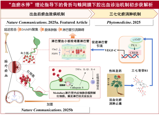 “血瘀水停”源于《金匮要略》“血不利则为水”的论述,是中医药理论体系中关于出血、创伤类疾病的核心病理概念。“化瘀消肿”是中医药防治出血和瘀血性疾病的核心理论之一,但其现代科学内涵仍未得到系统阐明。上海中医药大学王拥军、梁倩倩团队以创伤性骨折与蛛网膜下腔出血两类高危害性出血相关疾病为对象,阐明了“瘀血”致病机制:骨折后淋巴管引流血小板形成栓子,导致淋巴引流障碍、水肿及愈合延迟;蛛网膜下腔出血后脑膜淋巴管引流红细胞,经Cathepsin S介导降解引发淋巴结炎症放大反应,加重脑损伤。从“伤科圣药”三七中筛选出活性成分三七皂苷R1,明确其通过激活cAMP/PKA/CREB通路上调VEGF-C表达,恢复淋巴引流。研究成果2025年发表在Nature Communications等。该进展为中医药治疗出血性疾病提供了新策略,也通过现代生物学方法深化了对中医药理论的理解,推动了中医药学与现代医学的融合。