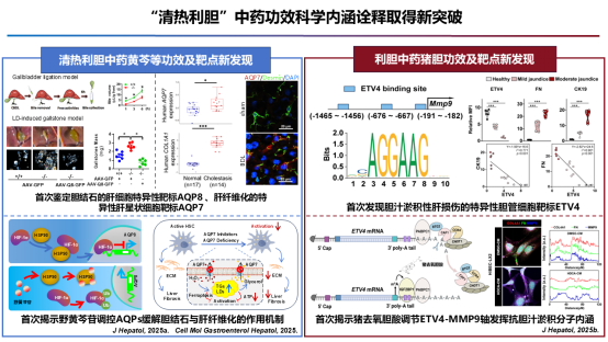 胆结石和胆汁淤积性肝损伤是常见的肝胆疾病,有继发肝纤维化或肝硬化的风险,尚缺少有效的防治方法。南京中医药大学麻彤辉团队、北京中医药大学李晓骄阳团队、大连医科大学霍晓奎团队发现黄芩等“清热利胆”中药的活性成分野黄芩苷通过促进水通道蛋白AQP8基因转录负调控因子HIF-1α的泛素化降解,维持AQP8表达,促进水转运,稀释胆汁进而减缓胆结石形成与胆汁淤积性肝纤维化。同时,猪胆主要成分猪去氧胆酸可促进m6A依赖性的胆管上皮细胞ETV4翻译效率,实现其下游基质MMP9依赖性的ECM降解,减缓胆汁淤积性肝纤维化进程。研究成果2025年两次发表在Journal of Hepatology。该进展初步揭示了中药“清热利胆”,改善胆汁淤积性肝病的作用机理。