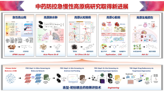 高原特殊自然环境致使系列急慢性高原病频发,严重威胁地区人民健康。军事科学院军事医学研究院高月、周维团队从低氧应答互作的角度,创新揭示了急性高山病易感的“蛋白-代谢”多层分子网络,发现了高原性心脏病特异的肠菌-宿主共代谢模式,确证了急性高原肺水肿关键防治靶标MEK2等,支撑创建了包含AI驱动细胞画像、3D气血屏障模拟等表型药筛技术的“表型-靶标耦合”中药新药发现技术框架,丰富了高原病药筛模型选项,并创新发现了系列可用于急慢性高原病防治的候选方药。研究成果2025年发表在Exploration、Cardiovascular Research、Acta Pharmaceutica Sinica B、Engineering等,授权国家发明专利1项,获批军队特需药品临床前研究立项2项。该进展作为中药防控高原病风险的示范研究,提升了高原病防治与科学研究能力,为推动高原中医药学科发展、服务国家重大战略提供了有力支撑。
