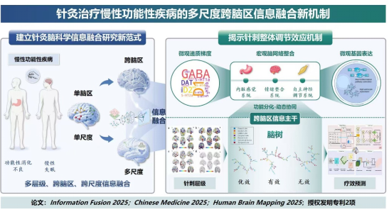 针刺治疗效应的中枢作用机制长期缺少在人体层面系统且可验证的实证依据。成都中医药大学曾芳、余思奕团队提出了“多层级、跨脑区、跨尺度信息融合”的研究新范式,以功能性消化不良和慢性失眠等疾病患者为对象,综合脑连结组学、成像转录组学与复杂网络智能建模方法,阐明针刺疗效相关脑区的功能层级结构及分级协同特征,不同层级脑区以“分化—协同”并行的动态整合方式介导针刺效应实现;构建了“宏观脑网络协同—跨脑区信息主干传递—微观分子调控”的多尺度证据链,深入揭示针刺整体调节效应的中枢信息融合机制。研究成果2025年发表在Information Fusion、Human Brain Mapping、Chinese Medicine等,授权国家发明专利2项。该进展推动了针灸机制研究从经验驱动的单模态局部分析到数智驱动的跨尺度系统解析的范式转变。