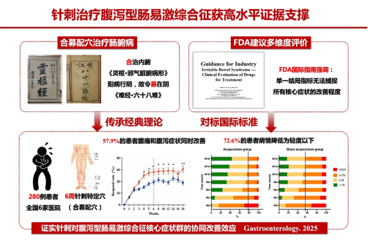 肠易激综合征(IBS)是全球高发的功能性胃肠病,患者多为年轻人,症状反复、迁延难愈,带来显著疾病负担。腹泻型肠易激综合征(IBS-D)为其最常见亚型。北京中医药大学刘存志团队采用腹泻天数与腹痛程度综合评估体系,通过280例患者的临床研究系统评价了针刺疗法的有效性与安全性,证实针刺能显著改善IBS-D核心症状。研究成果2025年发表在Gastroenterology。该进展为IBS-D患者提供了一种有效的非药物疗法。