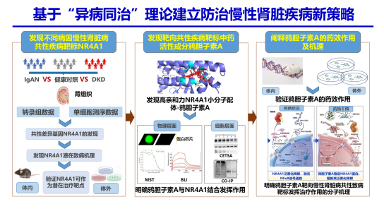 慢性肾脏病(如IgA肾病、糖尿病肾病)是导致肾衰竭的主因,机制复杂,缺少共性治疗靶点。IgA肾病与糖尿病肾病虽病名、病因各异,却共同表现为系膜细胞异常增殖与细胞外基质沉积这一关键病理过程,最终均导致肾衰竭。基于中医“异病同治”理论,广东省中医院刘良、潘胡丹团队和中国人民解放军总医院陈香美团队发现孤儿受体NR4A1是IgA肾病与糖尿病肾病共性致病靶标,鸦胆子素A是NR4A1的内源性配体,其通过精准结合NR4A1,阻断其泛素化降解、显著增强蛋白稳定性,进而抑制NF-κB炎症通路的过度激活,从而减轻肾脏损伤、延缓疾病进展。研究成果2025年发表在Signal Transduction and Targeted Therapy。该研究建立了“蛋白质稳定化”治疗新范式,为难治性肾病的靶向治疗提供新思路。