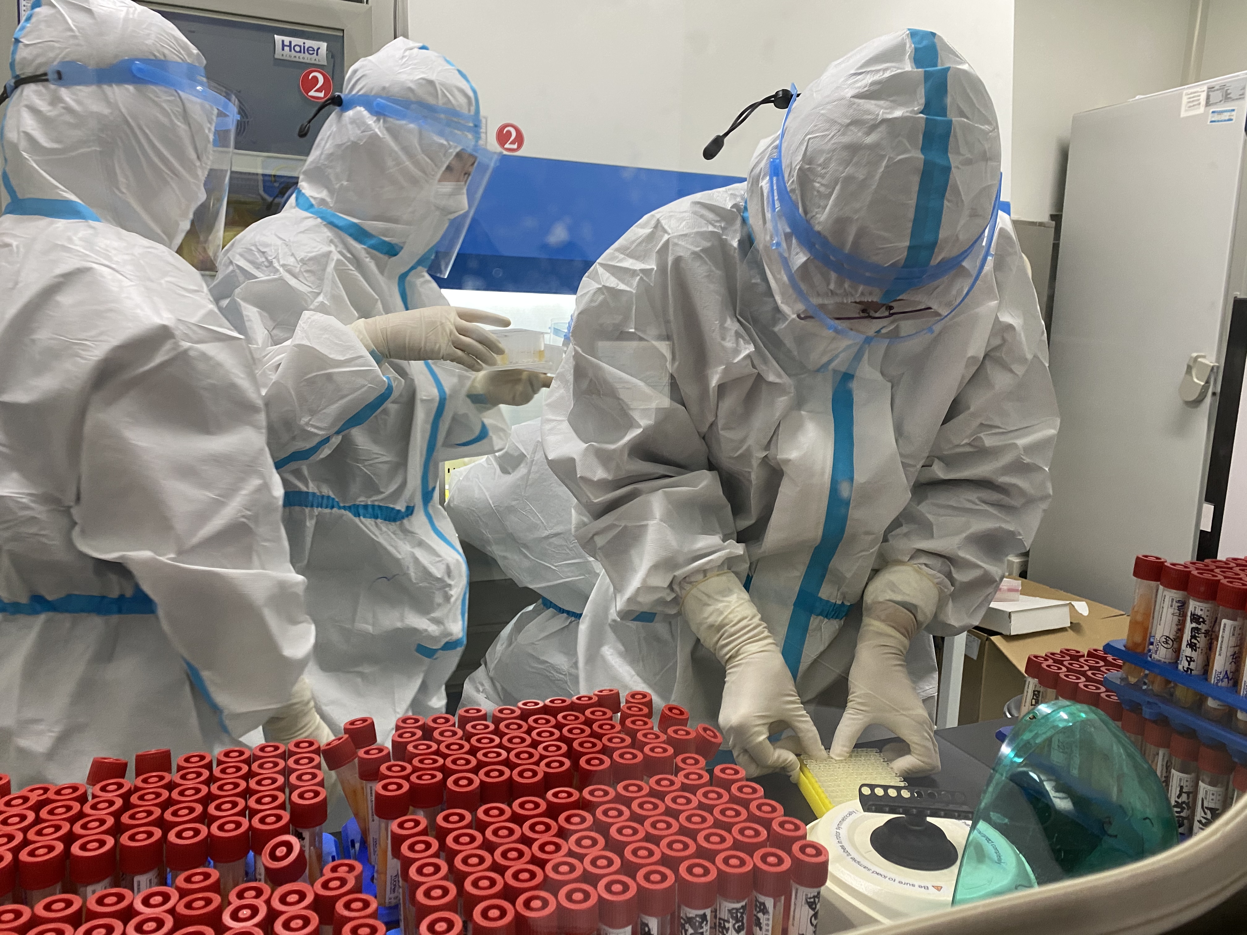 “超人”的她有更多的柔情,只是将最多的关怀给了科室人员。自己的孩子元旦外出,返石后被要求居家隔离,本来说好给孩子买些生活用品送过去,几天过去了连给孩子打个电话的时间都没有。但却把科里核酸检测人员的一日三餐、生活起居安排的妥妥当当,让科室的检测人员有更多的精力连续作战。由于时间紧任务重,东院区检验科9人被分成三组,每组负责一段实验过程,试剂配制、样本提取、上机扩增出报告,就像流水线上的三个模块,配合非常默契。而每一组从准备到检测结束是四个小时,这四个小时他们要严密的着装,衣服湿透,还要克服起雾的护目镜,或许早已转化为汗水、或许被紧张的工作所忘记,这几个小时他们没有一点尿意。只是在非常有限的实验间隙,简单的吃口饭,有几分钟的空闲他们就在简易床铺休息一下。他们中间一半以上是90后,也都是父母眼中的宝贝,当穿上那身特殊的服装,就成为守护人民健康的天使。张淑兰看到他们认真工作的场景、看到他们蜷缩在实验室一角休息的画面,泪目之余,更多的是心疼。