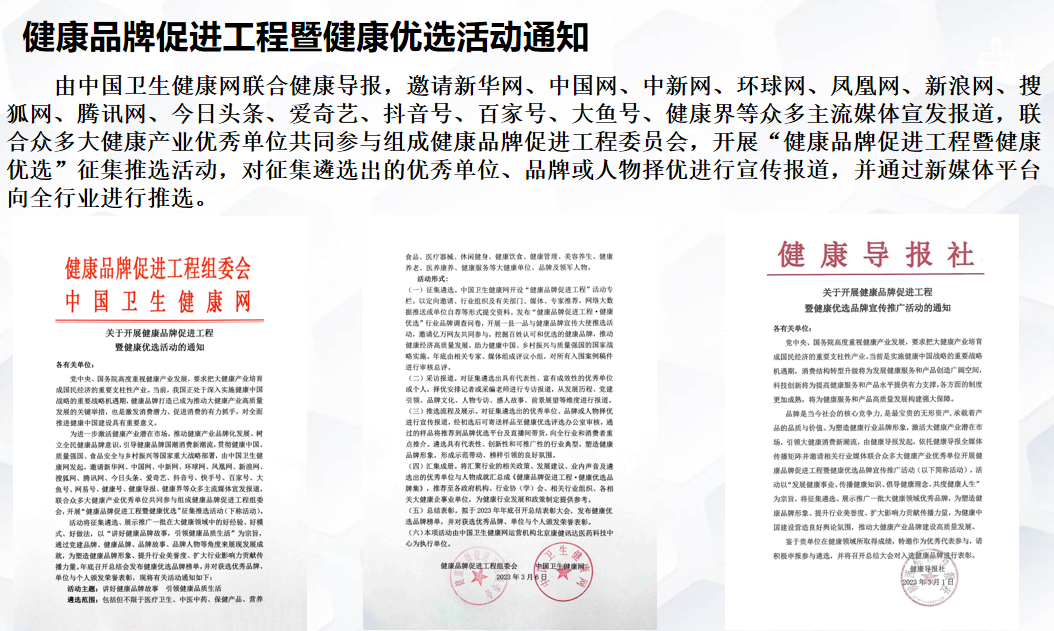 为进一步激活健康产业潜在市场,推动健康产业品牌化发展、树立全民健康品牌意识,引导健康品牌国潮消费新潮流,贯彻健康中国、质量强国、食品安全与乡村振兴等国家重大战略部署,由中国卫生健康网发起,邀请新华网、中国网、中新网、环球网、凤凰网、新浪网、搜狐网、腾讯网、今日头条、爱奇艺、抖音号、快手号、百家号、大鱼号、网易号、健康号、健康导报、健康界等众多主流媒体宣发报道,联合众多大健康产业优秀单位共同参与组成健康品牌促进工程组委会,开展“健康品牌促进工程暨健康优选”征集推选活动(下称活动)。