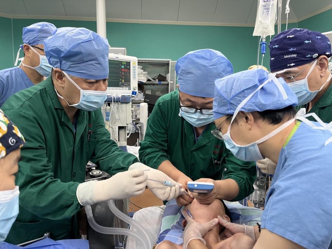 幸亏经过病房积极处理,患儿血氧回升。然而到了11点左右,险情又再度出现,患儿因呼吸道压迫极度烦躁不安,血氧很难维持。此时各学科专家已到位,肖海平主任要求紧急手术,麻醉科陈主任接到肖主任电话后,立即带领麻醉团队开始全力运转。