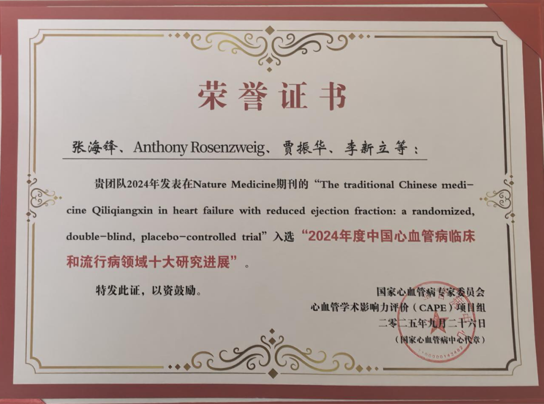 喜报!芪苈强心入选“2024年度中国心血管病临床和流行病领域十大研究进展”[ 2025-9-29] 作者:中国卫生健康网 字号:() () 阅读量:25732