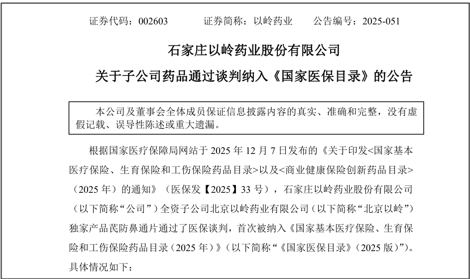 对真创新“真支持”!以岭药业一类新药芪防鼻通片首次纳入国家医保[ 2025-12-8] 作者:中国卫生健康网 字号:() () 阅读量:5184