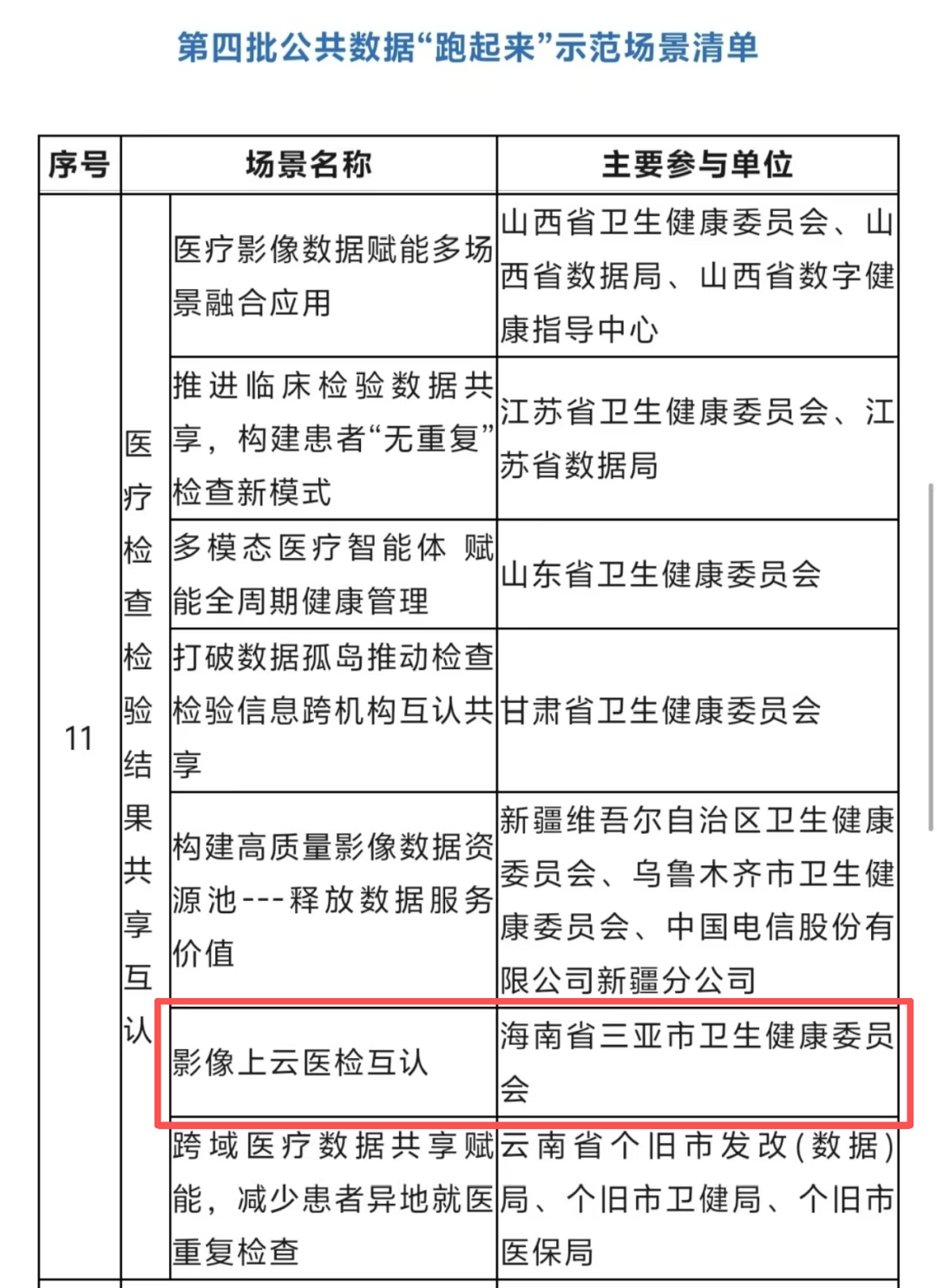 12月22日,国家数据局联合多部门召开“数据价值化我们在行动”新闻发布会(第四场),正式发布第四批公共数据“跑起来”示范场景清单。三亚市卫生健康委员会申报的“医疗检查检验结果共享互认 影像上云医检互认”场景成功入选,标志着三亚卫生健康领域公共数据开发利用工作获国家层面认可,为海南自由贸易港医疗卫生事业高质量发展注入三亚动能。
