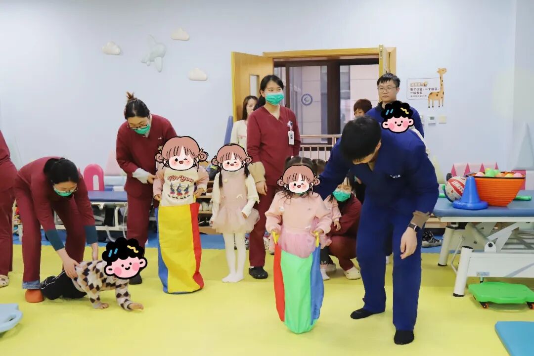 除了与动物互动,康复治疗师团队还精心设置了精细游戏和感统游戏两大板块。在贴纸画、夹弹珠的专注中,孩子们锻炼着手眼协调;在划船比赛、袋鼠跳的欢闹中,他们的感觉统合能力与团队意识得到提升。“感统游戏能改善大脑处理感觉信息的功能,提高身体协调能力。”陈越平主任说,“我们也希望能教会家长,回家后也能和孩子做这类互动游戏。”另一位家长感慨:“这样的孩子能玩在一起就很好,这样的活动非常有意义。”