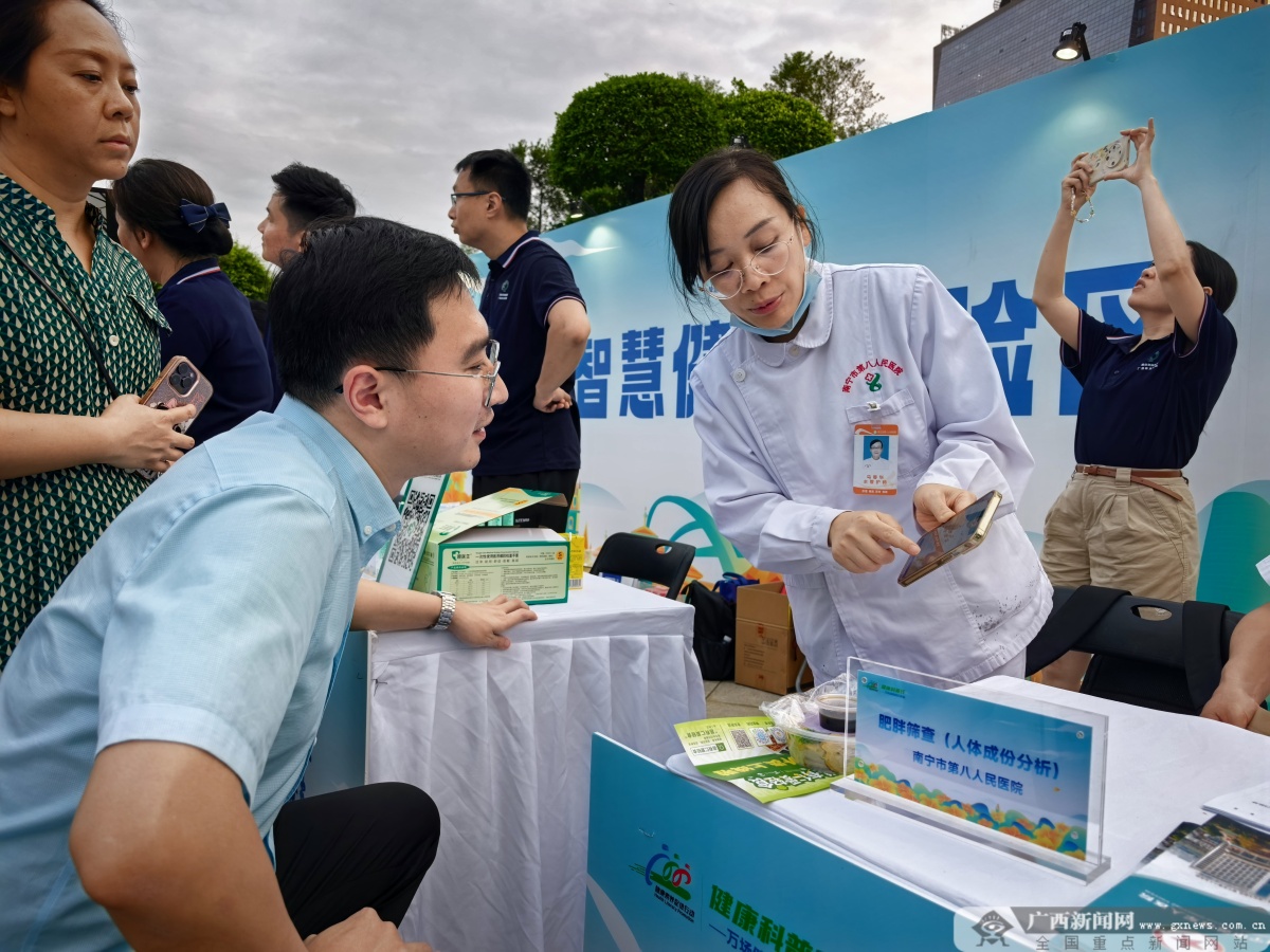 智慧健康体验区里,体脂仪、舌诊仪等设备免费开放,护士耐心引导市民操作,解读健康数据;急救技能体验区是现场的热门打卡点,急救导师手把手教学心肺复苏、海姆立克急救法,不少市民排队体验,学会了实用的应急保命技能。传统功法展演区,医护人员带来了八段锦展演,一招一式舒展有力,引得市民驻足观看、跟着比划。还有壮药香囊DIY体验区,大家跟着指导,亲手制作草药香囊,在趣味活动中了解壮医药文化。