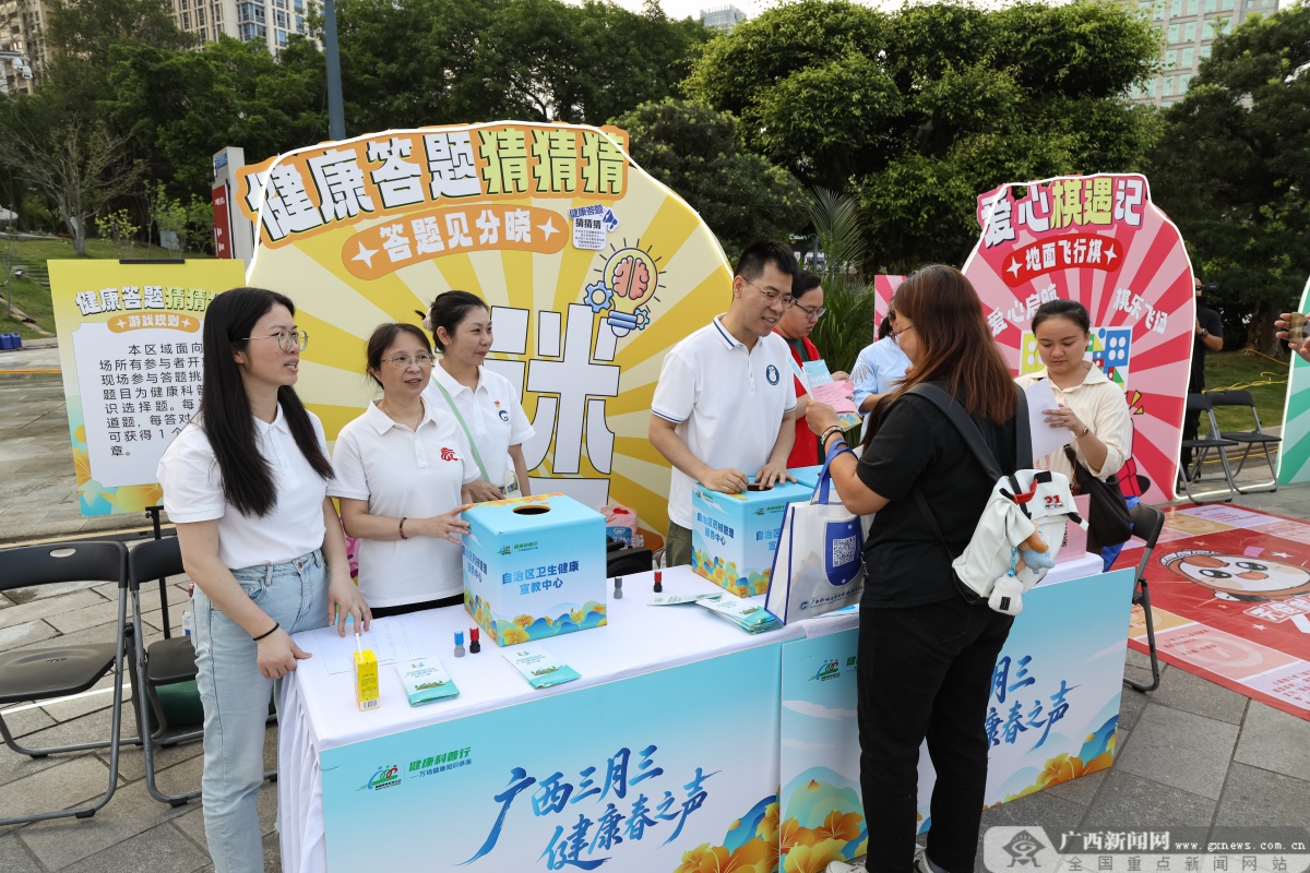春意融融歌圩起,健康相伴暖人心。,南宁市民歌湖叶脉广场热闹非凡,“广西三月三·健康春之声”健康文化大集在这里温情开市。活动由自治区卫生健康委、南宁市人民政府等部门联合开展,以“健康素养,让生活更美好”为主题,把优质医疗服务、趣味健康科普送到市民家门口,让大家在逛“健康大集”的轻松氛围里,收获实实在在的健康福利。